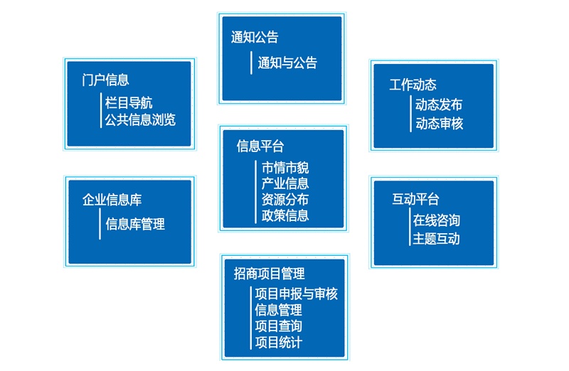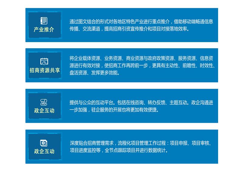 根據(jù)招商引資工作發(fā)展的額新要求,招商管理系統(tǒng)包含招商引資動態(tài)信息的發(fā)布、資源共享、招商項目管理和跟蹤、咨詢反饋、互動交流等功能。系統(tǒng)從應用角度應考慮實現(xiàn)pc端和移動APP客戶端的功能,并且需要根據(jù)不同層次用戶的需求提供相應的業(yè)務功能,其中用戶角色包括市領(lǐng)導、市商務局、市直部門、縣(市、區(qū))商務局(招商局)、異地所屬商會,公眾用戶等。